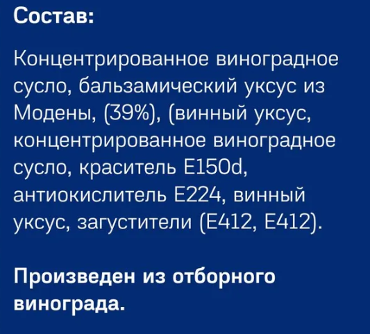 Концентрированное виноградное сусло, бальзамический уксус из Модены, (39%), (винный уксус, концентрированное виноградное сусло, краситель Е150d, антиокислитель Е224, винный уксус, загустители (Е412, Е412).