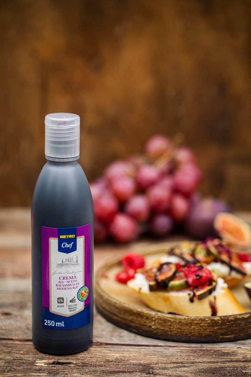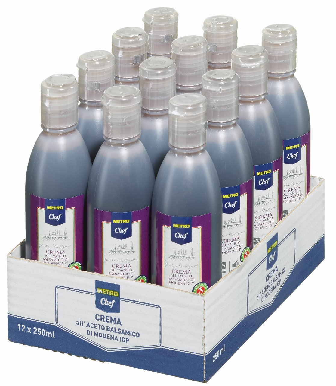 METRO Chef Бальзамический крем-уксус из Модены, 250мл отлично подходит к салатам, овощам, рыбе, птице, мясу, сыру, фруктам и даже мороженому. Продукт обладает сбалансированным, приятным запахом, не забивает вкус продуктов, а только подчеркивает его, обладая изысканным и утонченным виноградным вкусом. Любое повседневное блюдо можно превратить в деликатес, дополнив его вкусным соусом или заправкой. Особую изюминку вашему блюду поможет придать бальзамический крем-соус.