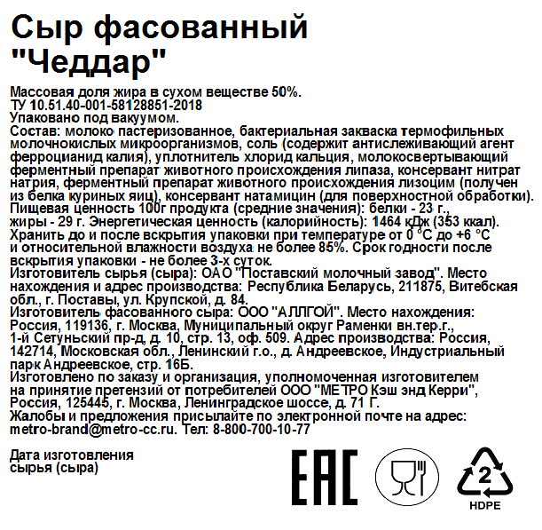 Сыр METRO Chef Чеддар 50% изготовлен из коровьего молока без добавок и ГМО. Продукт характеризуется острым вкусом с резковатой кислинкой, гладкой и плотной текстурой, сливочным цветом с желтоватым оттенком. В состав полутвердого сорта сыра входят пастеризованное молоко, соль, бактериальная закваска молочнокислых микроорганизмов, безопасные красители. Продукт используется в кулинарии в качестве закуски, в сочетании с алкоголем, некоторыми блюдами: омлетами, бисквитами, мясной нарезкой. Чеддер хорошо дополняет вкус мяса, рыбы и овощей, входит в состав некоторых соусов. Его используют как основной ингредиент для гренок, канапе. Сырная нарезка поставляется в пластиковом контейнере, удобном для переноски и хранения, чтобы исключить его высыхание.