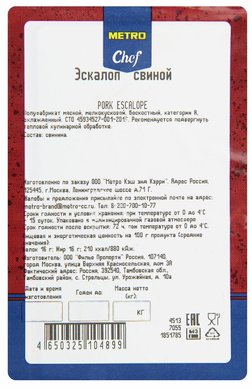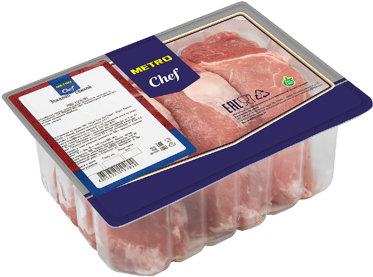 Это постный карбонад с тонким слоем жира по краю, нарезанный на ровные пласты одинакового размера. Лучше всего эскалоп подходит для жарки на сковороде или на открытом огне (гриль или барбекю). Перед приготовлением каждый кусочек необходимо отбить, посолить и приправить специями. Панировкой такое мясо не покрывается. Не содержит ГМО. Продукт упакован с использованием защитной атмосферы, что позволяет сохранить все питательные и вкусовые качества в течение всего срока годности.