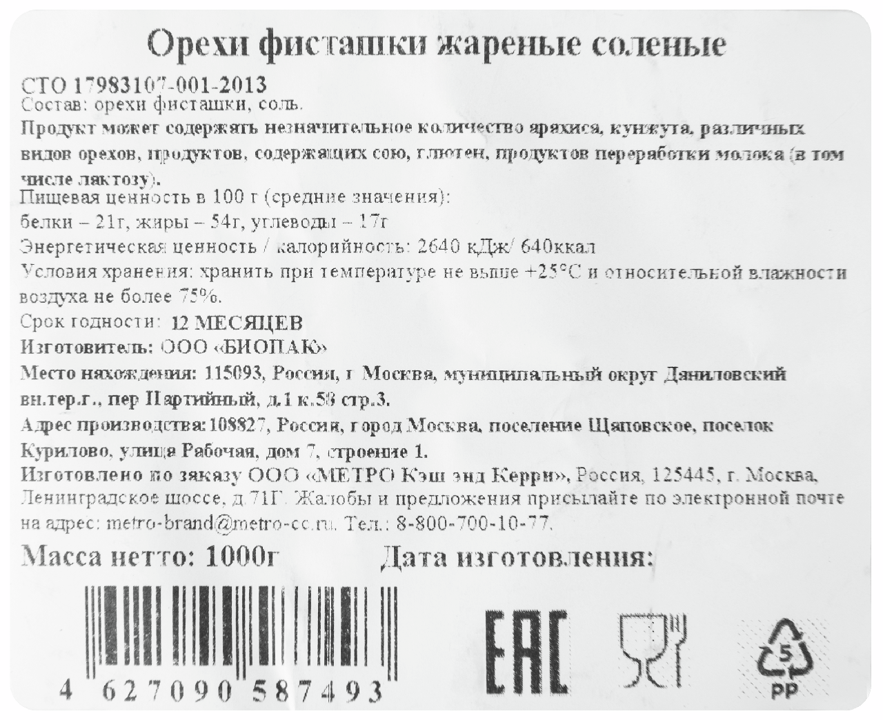 Фисташки METRO Chef равномерно прожарены без масла и содержат всего 3% соли. Удобной упаковки хватит надолго.