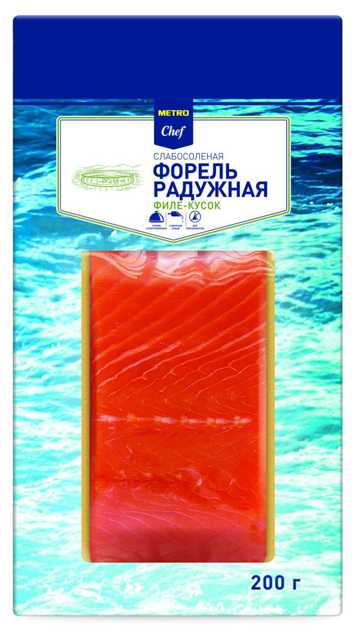 METRO Chef Форель радужная филе слабосоленая, 200г — нежная, тающая во рту деликатесная рыба. Продукт в меру соленый, хорошо сочетается с творожным сыром, лимоном, зеленью, а также гренками и хлебцами. Такая закуска выгодно смотрится как на повседневном, так и на праздничном столе и не оставляет равнодушным никого.Товары под брендом METRO Chef разработаны и протестированы совместно с представителями ресторанного бизнеса. Это продукты, созданные шеф-поварами для шеф-поваров и людей, увлеченных гастрономией. Это качество, отвечающее высоким требованиям профессионалов ресторанного бизнеса. Это большие упаковки и оптовые цены.Приобрести METRO Chef Форель радужная филе собосоленая, 200г можно в торговом центре METRO.
