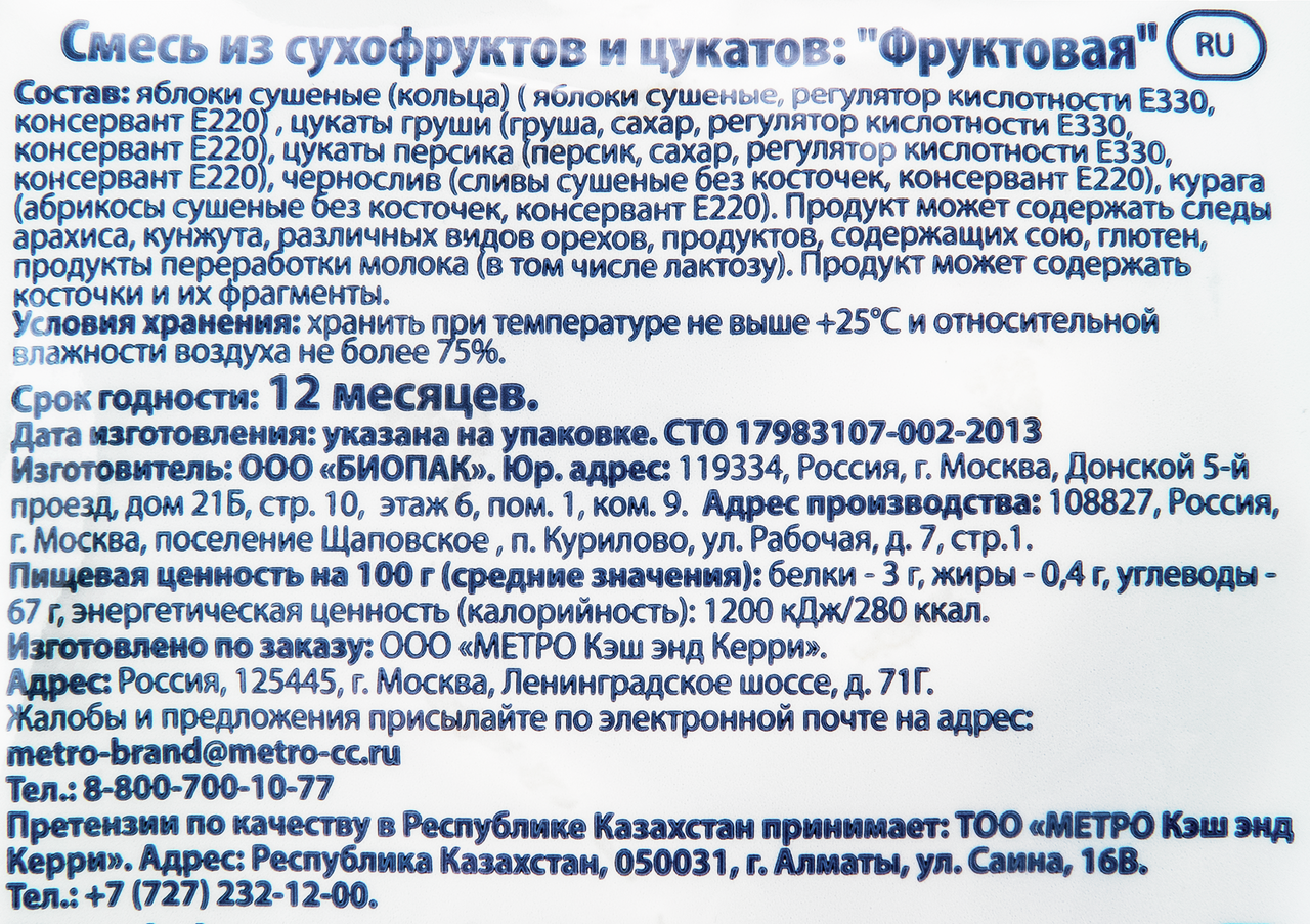 Яблоки сушеные (кольца), (яблоки сушеные, регулятор кислотности Е330, консервант Е220), цукаты груши (груша, сахар, регулятор кислотности Е330, консевантр Е220), цукаты персика (сахар, регулятор кислотности Е330, консевантр Е220), чернослив (сливы сушеные без косточек, консервант Е220, курага (абрикосы сушеные без косточек, консервант Е220), Продукт может содержат следы арахиса, кунжута, различных видов орехов, продктов, содержащих сою, глютен, продукты переработки молока, в том числе и лактозу. Продукт может содержать косточки и их фрагменты. Может содержать следы арахиса, кунжута и различных видов орехов, косточки и их фрагменты.