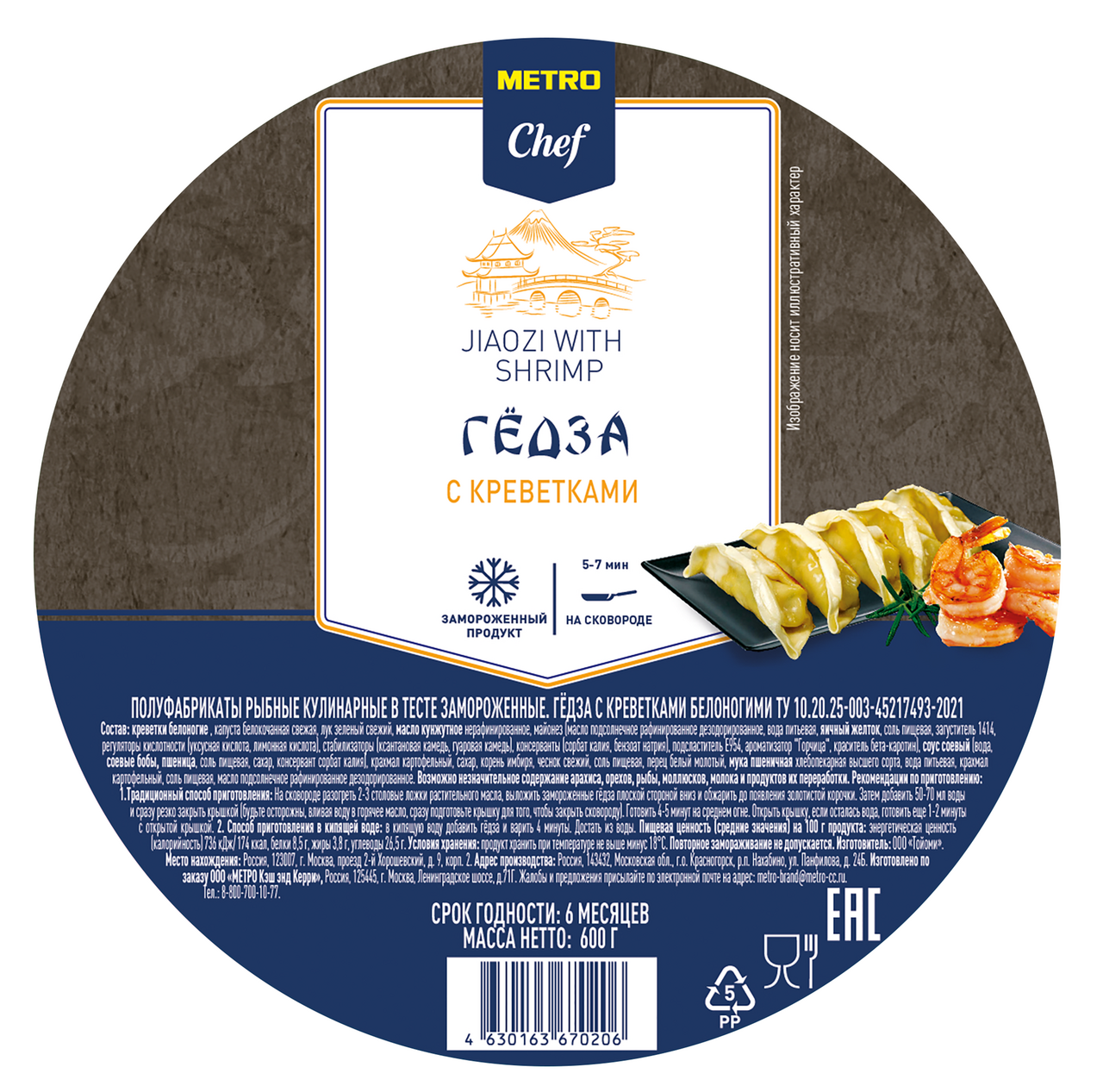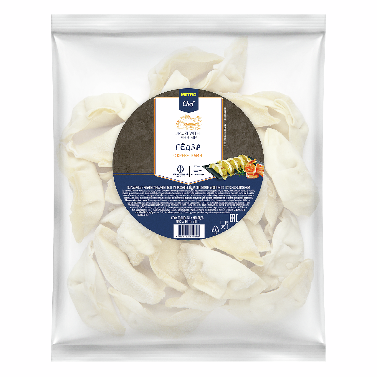Гёдза, известные также под названием цзяоцзы, широко распространены в китайской, корейской и японской кухнях и похожи на наши пельмени. Гёдза METRO Chef с креветками - это тонкое пресное пшеничное тесто с мясом белоногой креветки и капустой. Традиционный способ приготовления: На сковороде разогреть 2-3 столовые ложки растительного масла, выложить замороженные гёдза плоской стороной вниз и обжарить до появления золотистой корочки. Затем добавить 50-70 мл воды и сразу резко закрыть крышкой (будьте осторожны, вливая воду в горячее масло, сразу подготовьте крышку для того, чтобы закрыть сковороду). Готовить 4-5 минут на среднем огне. Открыть крышку, если осталась вода, готовить еще 1-2 минуты с открытой крышкой. Можно также приготовить в кипящей воде: в кипящую воду добавить гёдза и варить 4 минуты. Достать из воды.