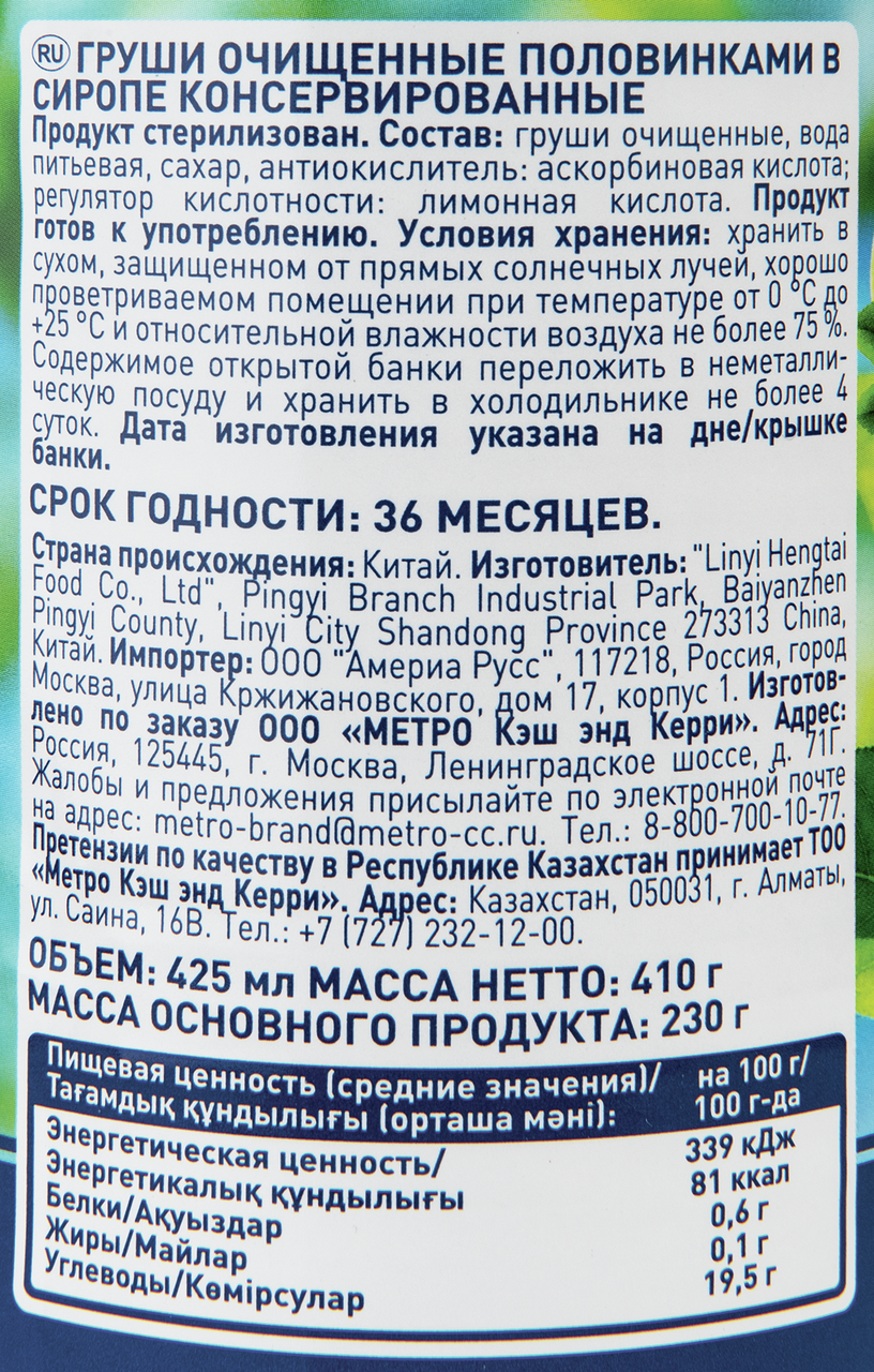 Metro Chef Груши очищенные половинки в сиропе 425 мл — ароматное и сочное лакомство. Его подают в прозрачной вазочке или нарезанными на порционные кусочки. Груши добавляют в выпечку (торты, пироги, кексы), освежающие коктейли или питательные смузи. Дольки отлично смотрятся в виде украшения указанных продуктов. Сироп используют для приготовления соусов. Его можно выпить вместе с хрустящим печеньем или кусочком свежеиспеченного хлеба. Груши отлично утоляют голод и подходят для быстрого перекуса. Сладость придает сил, насыщает организм клетчаткой, пектином и глюкозой, поднимает настроение. Фрукты полезны при анемии, повышают уровень гемоглобина. Они активизируют обменные процессы, стабилизируют работу печени и почек, борются с сердечно-сосудистыми заболеваниями. Витамины группы В благотворно влияют на нервную систему, устраняя повышенную возбудимость и бессонницу. Аскорбиновая кислота укрепляет иммунитет. Продукт не содержит ГМО, вредных добавок и красителей. Он продается в жестяной банке. После ее вскрытия лакомство хранят в холодильнике.
