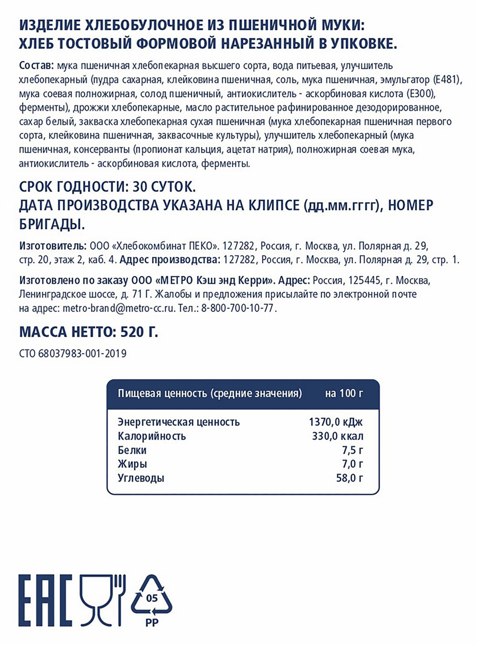 METRO Chef Хлеб тостовый пшеничный нарезка, 520г