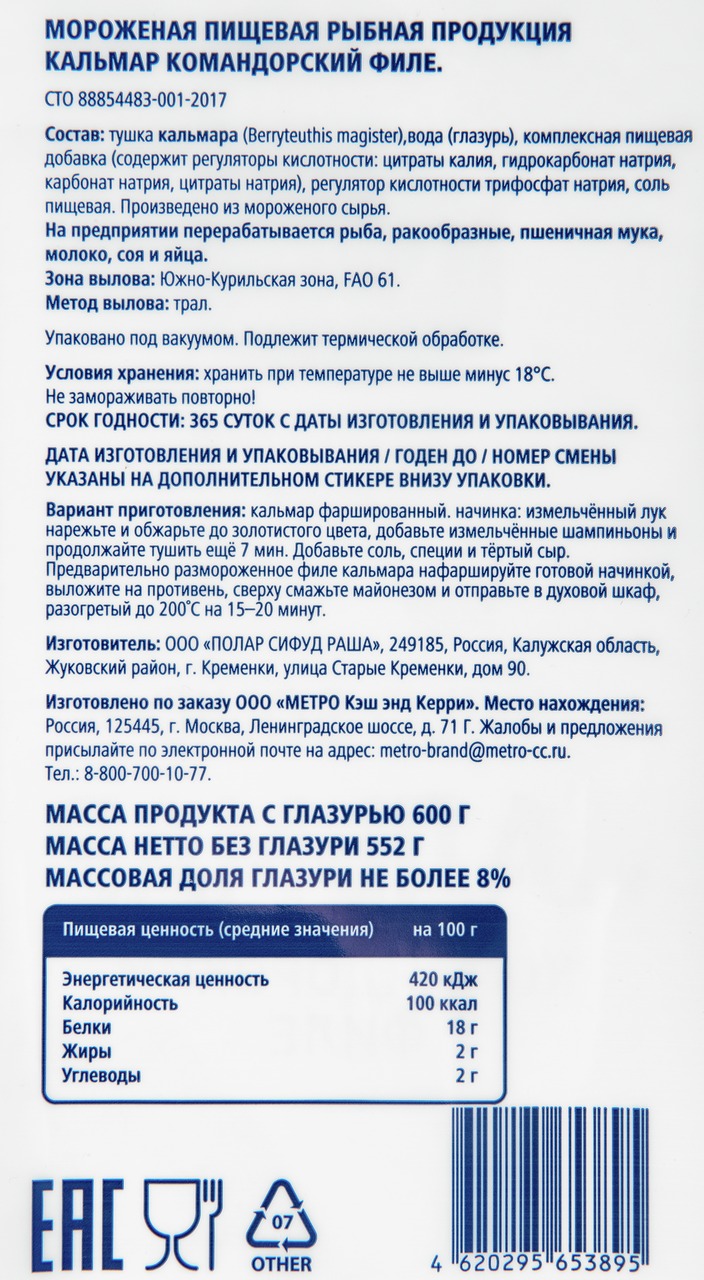 METRO Chef Кальмар Командорский филе свежемороженый, 600г