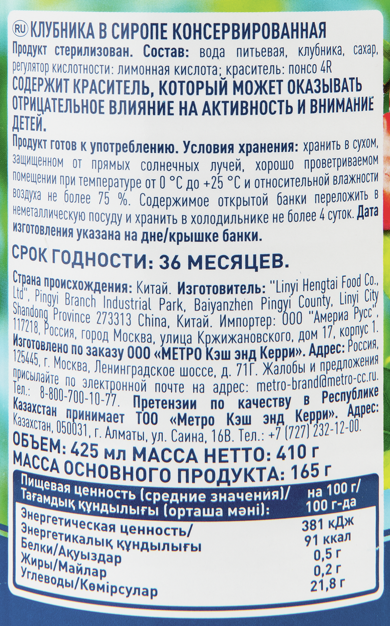 Metro Chef Клубника в сиропе 425 мл — вкусное и полезное лакомство, которое понравится любому сладкоежке. Отборные крупные плоды с крепкой структурой подают к завтраку или полднику, а также праздничному столу в прозрачной вазочке. Они придают приятный ягодный вкус творогу, ряженке, натуральному йогурту или кефиру. Клубнику добавляют в выпечку (пирожки, торты, кексы, запеканки), коктейли или смузи. При помощи блендера из нее получается ароматная паста для подрумяненных тостов из свежего хлеба, блинчиков и оладий. Сироп используют для приготовления соусов в качестве красителя и ароматизатора. Ягоды наполнены фенолами, которые укрепляют сердце, оказывают противовоспалительное действие. Клубника обладает мочегонным свойством, прекрасно справляется с отеками, нормализует работу щитовидной железы. В ней много антиоксидантов, замедляющих процессы старения в организме, омолаживающих клетки. Они также борются со стрессом, укрепляя нервную систему. Продукт не содержит ГМО, вредных добавок и консервантов. После вскрытия упаковки лакомство хранят в холодильнике.