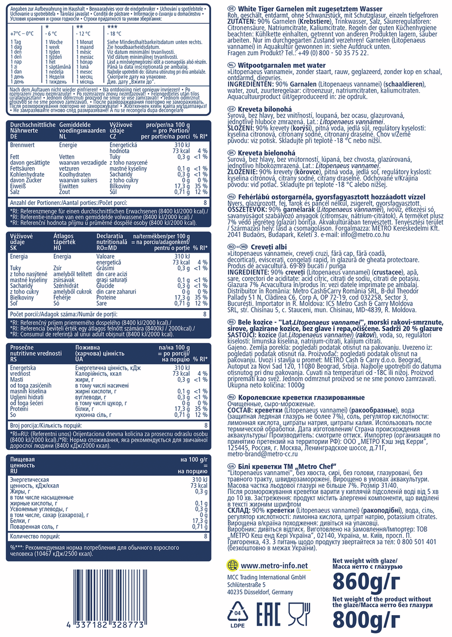 METRO Chef Креветки белоногие litopenaeus vannamei 31/40 шт/фунт (69/89 шт/упак) очищенные свежемороженые в упаковке 860г. Содержание глазури 7%.