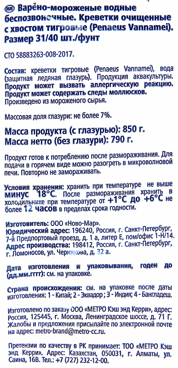 METRO Chef Креветки белоногие Penaeus vannamei очищенные варено-мороженые 31/40 шт/фунт (58/75 штук в упаковке) в пакете 850 г. Содержание глазури 7%. Продукт готов к употреблению после размораживания. Рекомендуется разморозить в холодильнике или под холодной проточной водой, не вынимая из пакета. Для подачи в горячем виде можно бланшировать в кипятке 2-3 минуты или разогреть в микроволновой печи. Повторное замораживание не допускается.