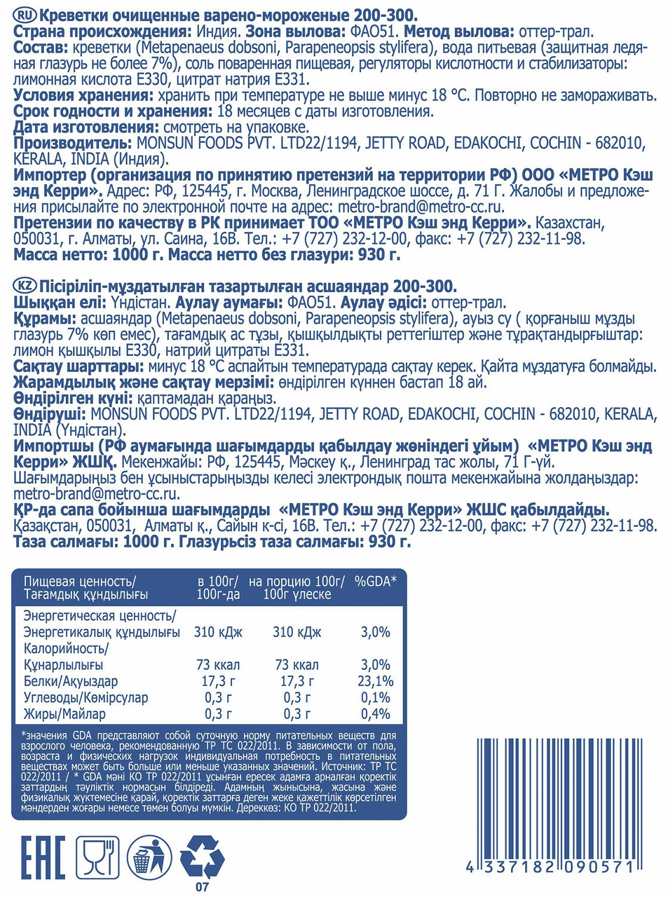 METRO Chef Креветки кадаль, кидди "коктейльные" Metapeneus dobsoni, Parapenaeopsis Stylefera 200/300 шт/фунт очищенные варено-мороженые в упаковке 1кг. Не требуют дополнительного приготовления, нужно только разморозить и по желанию бланшировать или разогреть любым способом. Удобно для использования в салатах. Содержание глазури 7%. Страна происхождения: Индия. Зона вылова: ФАО51. Метод вылова: оттер-трал.
