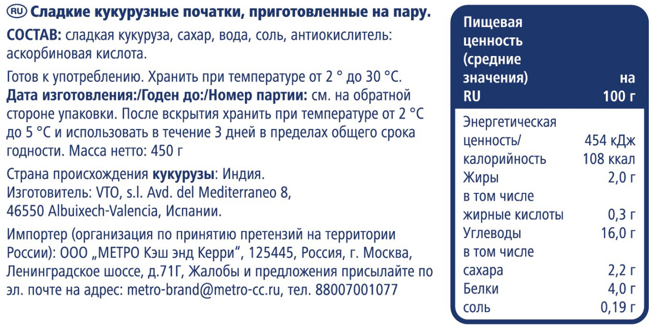 Кукуруза сладкая, вода, сахар, соль, антиокислитель Е300.