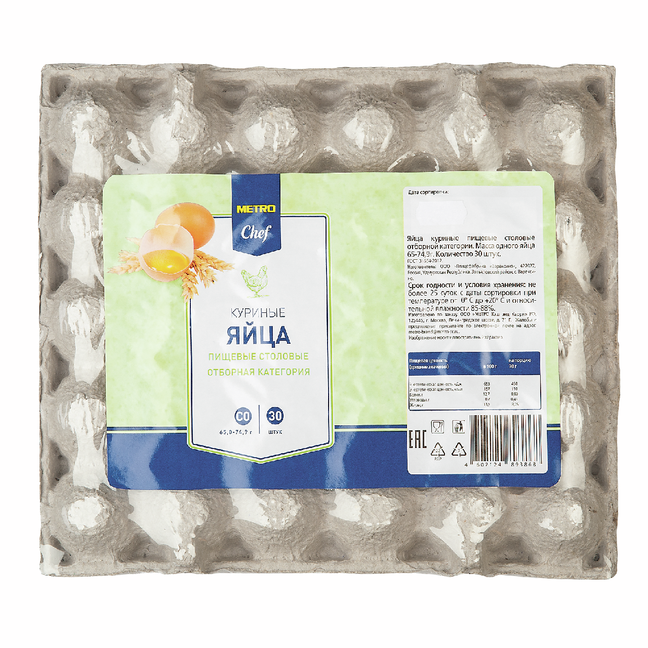 Яйцо Metro Chef Куриное С0, 30 шт – это высококачественный продукт, который постоянно используется как в домашних условиях, так и во всех предприятиях общественного питания. Невозможно перечислить все блюда, в которых яйца являются незаменимым ингредиентом. Их употребляют в жареном и вареном виде, варят вкрутую, всмятку, в мешочек, жарят в виде яичницы или омлета, добавляют различные продукты (колбасу, ветчину, сыр, грибы и т. д.). Яйца добавляют в тесто, в начинку, в кремы для сладкой и несладкой выпечки, используют в качестве заливки при запекании мяса и овощей, добавляют в кляр при обжаривании отбивных, цветной капусты. Они становятся основой соусов, незаменимым ингредиентом салатов и запеканок. Их употребляют даже в сыром виде. Яйца используются не только в кулинарии, но и в косметологии и нетрадиционной медицине. Поскольку сфера применения этого продукта огромна, очень важно обращать внимание на качество яиц. Производитель ответственно относится к процессу кормления кур-несушек и соблюдает все правила хранения и транспортировки яиц. Поэтому они не только соответствуют стандартам качества, но и не вредят организму как это бывает при добавлении в корм антибиотиков и различных добавок. Приобрести яйцо Metro Chef Куриное С0, 30 шт можно в торговом центре METRO.Выпуская продукцию под собственными торговыми марками METRO, мы стремимся максимально удовлетворить потребности наших клиентов. Наша цель – понять, какой ассортимент для них актуален и предложить его по привлекательной цене. Мы также внимательно изучаем тенденции рынка, чтобы быть в курсе последних трендов и своевременно предлагать решения под собственными торговыми марками в соответствии с ними. Бренд METRO Chef хорошо известен во всем мире. Продукция этой торговой марки отличается отменным вкусом и превосходным качеством.