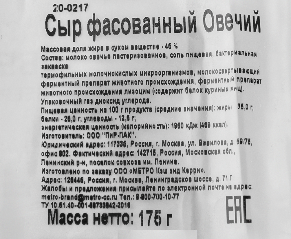 Metro Chef Сыр овечий 45%, 175г – вкусный и полезный продукт от компании Метро. Сыр овечий изготавливается из натурального молока овец, поэтому он полностью безопасен для здоровья. Сыр овечий имеет высокое содержание кальция, который помогает укреплять кости и зубы. Продукт предназначен для любителей вкусной и полезной пищи.