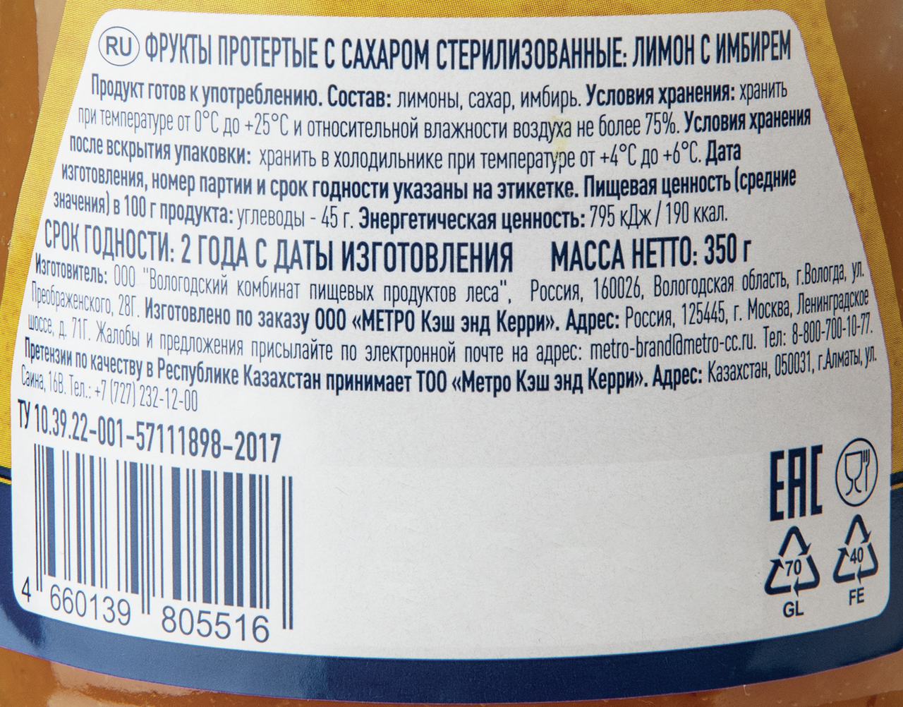 Протертые лимон с имбирем METRO Chef - новинка в линейке варенья и джемов. Этот продукт очень вкусный и полезный. Он отлично подойдет для чаепития летом и зимой. Протертые лимон с имбирем METRO Chef - это яркий натуральный вкус и уникальное сочетание целебных свойств лимона с одной из самых полезных пряностей - имбирем.