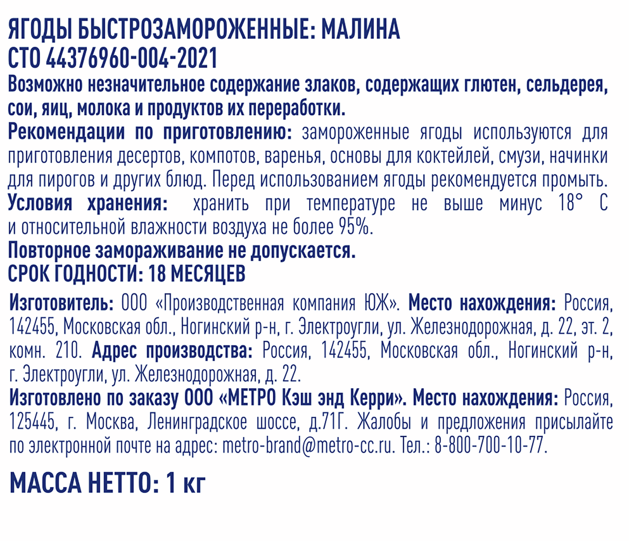 Рекомендации по приготовлению: замороженные ягоды используются для приготовления десертов, компотов, варенья, основы для коктейлей, смузи, начинки для пирогов и других блюд. Перед использованием ягоды рекомендуется промыть.