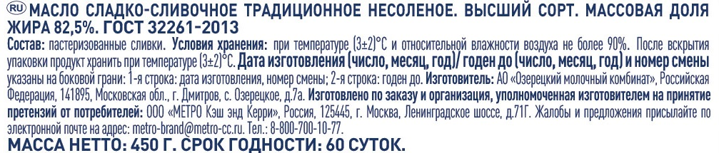 METRO Chef Масло сливочное традиционное 82.5%, 450г