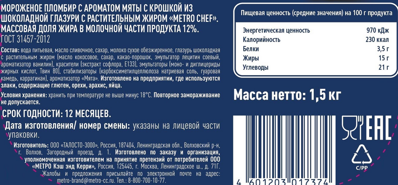 Вода питьевая, масло сливочное, сахар, молоко сухое обезжиренное, глазурь шоколадная с растительным жиром (масло кокосовое, сахар, какао-порошок, эмульгатор лецитин соевый, ароматизатор ванилин), красители (экстракт сафлора, E133), эмульгаторы (моно- и диглицериды жирных кислот, Твин 80), стабилизаторы (карбоксиметилцеллюлоза натриевая соль, гуаровая камедь, каррагинан), ароматизатор Мята.