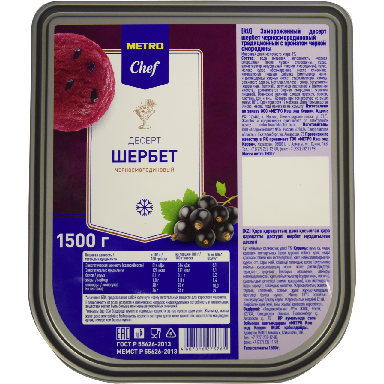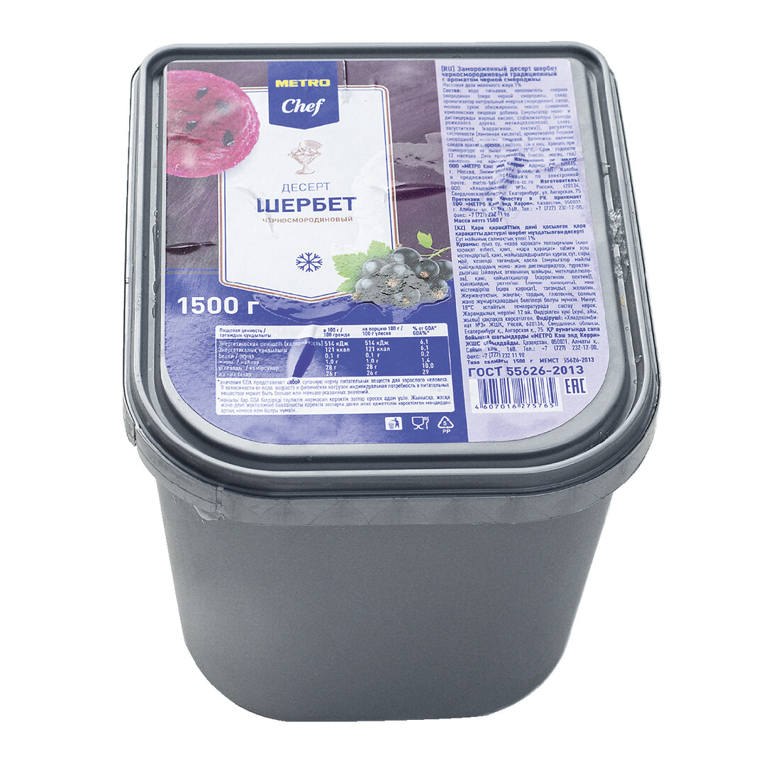 Попробуйте мороженое METRO Chef шербет Черная смородина БЗМЖ (без заменителя молочного жира, 1,5 кг, созданный на основе натурального фруктового пюре. Продукт обладает насыщенным вкусом и является источником витамина С благодаря использованию в составе натуральных компонентов. Ингредиентами также являются сливочное масло и обезжиренное молоко высшего качества, что придает шербету насыщенный сливочный вкус. Сочные кусочки и цельные ягоды, кисловатый вкус и натуральный состав без использования пальмового масла покорят вас. Продукт отлично подойдет для приготовления коктейлей и муссов, смузи и наполнителей для торта-мороженого. Заморозка позволяет сохранить свежесть и отменные вкусовые качества шербета. Обращ��ем ваше внимание, что в состав мороженого не входят заменители молочного жира.