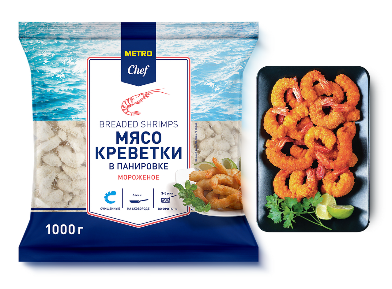 METRO Chef Мясо креветки в панировке замороженные, 1кг в удобном пакете с прозрачной зоной. Рекомендации по приготовлению: Перед приготовлением не размораживать. Во фритюре: Креветки обжаривать во фритюрном масле 3-5 минут при температуре 180С. Обжаренные креветки извлечь из фритюрного масла, дать стечь маслу в течение 10 секунд. На сковороде: Разогрейте сковороду. Добавьте и разогрейте растительное масло. Готовьте на среднем огне 6 минут. Переверните креветки через 3 минуты от начала приготовления.