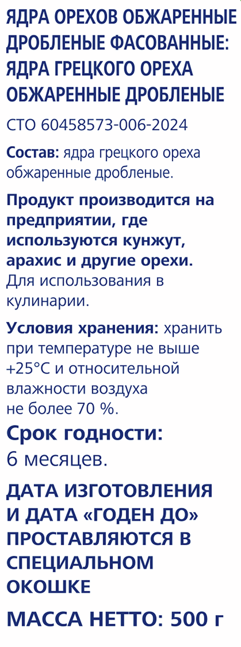 Ядра грецкого ореха обжаренные очищенные дробленые.