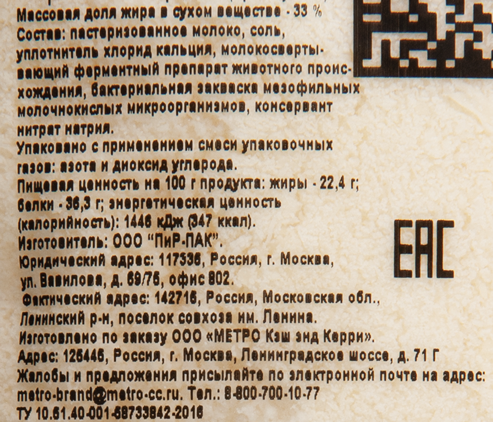 Metro Chef Сыр Пармезан тертый 33%, 150г – удобный и практичный формат измельчения твердого молочного продукта. Это готовый ингредиент для создания закусок, пиццы, равиоли и иных семейных блюд. Тертый сыр можно добавить в фарш для котлет, или загустить им соусы, подливы. При термообработке сырная стружка плавится, приобретает густую тягучую структуру, формирует красивую аппетитную корочку и придает блюдам нежный сливочный вкус. Пармезан для нарезки приготовлен по традиционной рецептуре из фермерского молока, соли и закваски. Он отличается приятным светло-желтым цветом, выразительным ароматом и сбалансированным вкусом. Деликатес содержит легкоусвояемый молочный белок, витамины и микроэлементы, благодаря чему хорошо усваивается и приносит пользу организму.