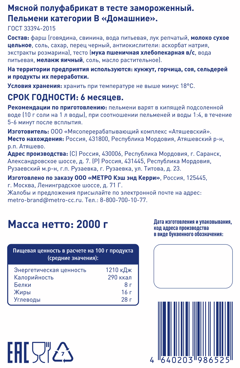 Пельмени домашние METRO Chef на 80% состоят из мяса, изготовлены по ГОСТ и не содержат мяса межанической обвалки. Рекомендации по приготовлению: пельмени варят в кипящей подсоленной воде (10 г соли на 1 л воды), при соотношении пельменей и воды 1:4, в течение 5-6 минут после всплытия. Категория В.