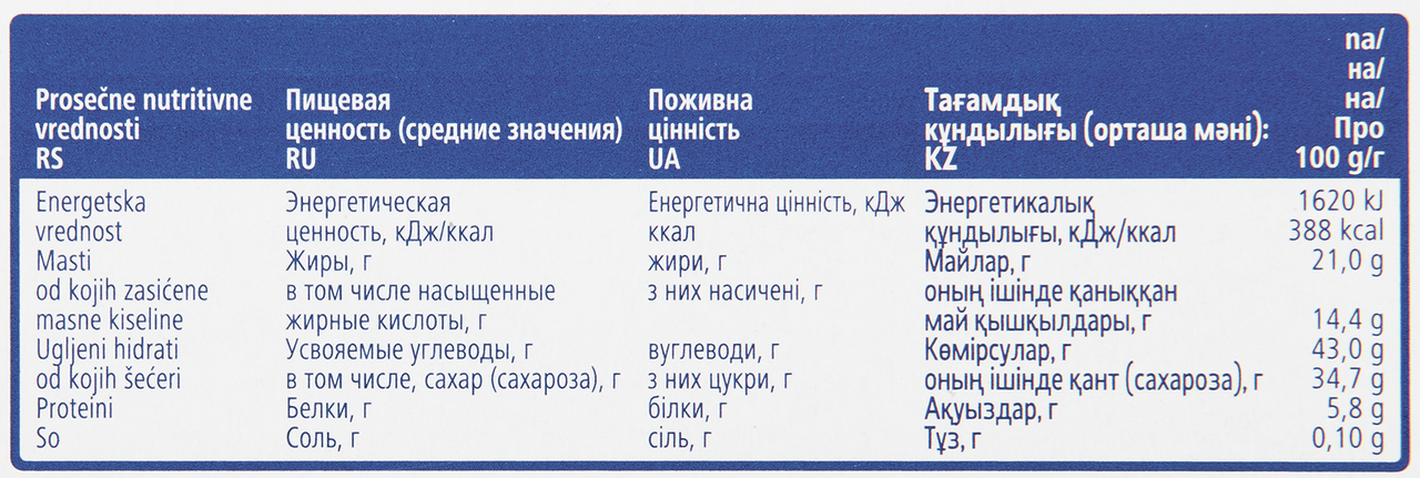 Яйца, сахар, шоколад (22%) (сахар, какао-масса, какао-масло, эмульгатор: соевый лецитин, ароматизатор: ваниль), вода, масло (содержит молоко), кокосовое масло, пшеничная мука, какао-порошок (2%), цельное сухое молоко (содержит эмульгатор: соевый лецитин).