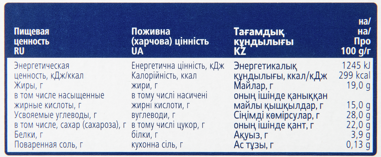 Вода, сахар, бисквит (цельное яйцо, пшеничная мука, сахар, глюкозно-фруктозный сироп, декстроза, эмульгатор: моно- и диглицериды жирных кислот, разрыхлители: пирофосфаты, карбонаты натрия, сухой яичный белок), взбитые сливки (молоко), восстановленное обезжиренное молоко (11%) (вода, сухое обезжиренное молоко), масла и жиры (кокосовый жир, масло какао), сыр маскарпоне (6,5%) (сливки, молоко, регулятор кислотности: молочная кислота, лимонная кислота), глюкозный сироп, вино Марсала, яичный желток (2,3%), молочные белки, обезжиренный порошок какао (1%), растворимый кофе (0,6%), пшеничная мука (0,24%), модифицированный кукурузный крахмал, желирующее вещество: альгинат натрия. Содержит пшеницу, яйцо, молоко, может содержать след орехов и сои.
