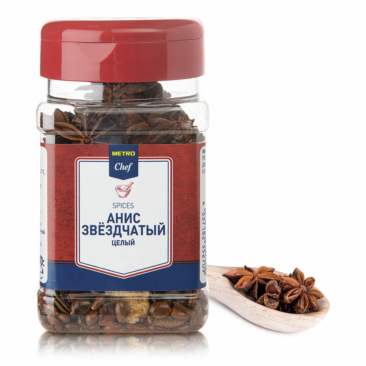 METRO Chef Приправа Анис звездчатый, 65г — высушенные плоды древовидного растения. Они используются в кулинарии в качестве пряности и отличаются горьковато-сладким вкусом и насыщенным сложным ароматом, который раскрывается при нагревании. Эта азиатская пряность идеально подходит для приготовления соусов, маринадов и выпечки. Ее также принято добавлять в кофе, какао и настойки. В азиатской кухне бадьяном традиционно приправляют блюда из утки и свинины — специя придает им пряность и неповторимый аромат. Бадьян гармонично сочетается с черным перцем, чесноком, луком, корицей, фенхелем, гвоздикой и имбирем. Перед применением его следует размолоть, а добавляют бадьян в блюда либо в самом начале готовки, либо за 5 минут до окончания и обязательно дают настояться под крышкой. Он богат такими биологически активными веществами, как эфирные масла, витамины, макро- и микроэлементы, смолы, полисахариды, танины и терпены. Бадьян стимулирует работу ЖКТ: повышает аппетит, нормализует пищеварение, избавляет от спазмов и улучшает перистальтику кишечника. Он также благоприятно влияет на эндокринную и нервную системы, укрепляет иммунитет.