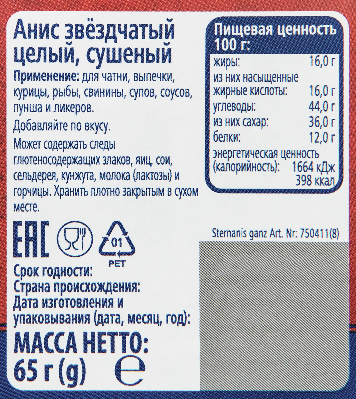Бадьян сушеный. Может содержать следы глютеносодержащих злаков.