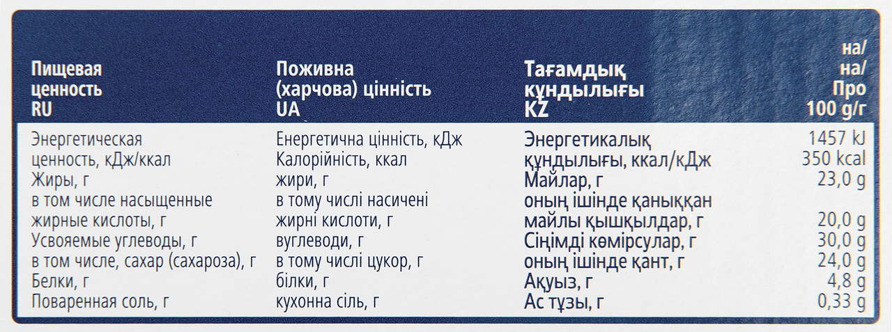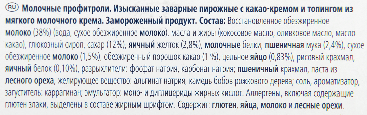Восстановленное обезжиренное молоко (вода, сухое обезжиренное молоко), масла и жиры (кокосовое масло, оливковое масло, масло какао), глюкозный сироп, сахар, яичный желток, молочные белки, пшеничная мука, сухое обезжиренное молоко, обезжиренный порошок какао, цельное яйцо, рисовый крахмал, яичный белок, разрыхлители: фосфат натрия, карбонат натрия, пшеничный крахмал, паста из лесного ореха, желирующее вещество: альгинат натрия, камедь бобов рожкового дерева, соль, ароматизатор, загуститель: каррагинан, эмульгатор: моно- и диглицериды жирных кислот. Содержит пшеницу, яйцо, молоко, может содержать след орехов и сои.
