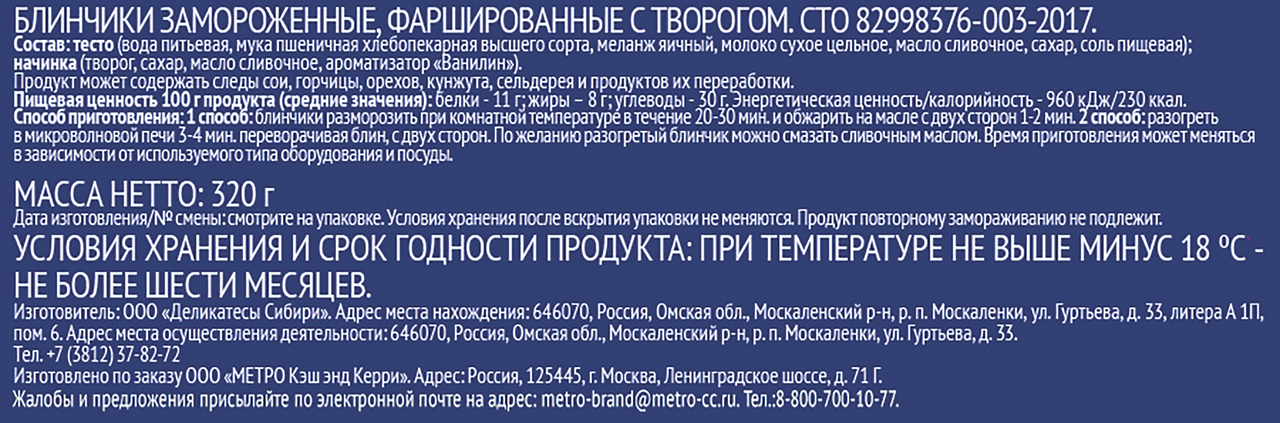 Вкусный и полезный завтрак – блинчики с творогом. Блинчики METRO Chef - настоящее лакомство, которое соберет за одним столом всю семьи. Замороженные блинчики METRO Chef достаточно просто разморозить при комнатной температуре в течение 20-30 минут и обжарить с двух сторон на сковороде 3-4 минуты, либо приготовить в микроволновой печи в течение 4-5 минут. Можно подавать блинчики с сахарной пудрой, сгущенкой, а можно экспериментировать с ягодными и фруктовыми топпингами.