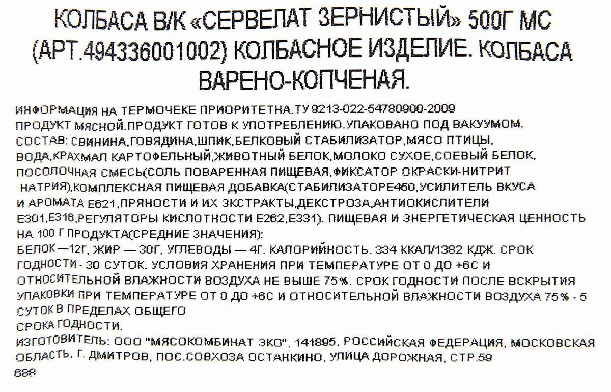 Говядина, свинина, шпик, вода, крахмал картофельный, животный белок, молоко сухое, посолочная смесь (соль поваренная пищевая, фиксатор окраски нитрит натрия), комплексная пищевая добавка (стабилизатор Е450, регулятор кислотности Е451, декстроза, пряности, антиокислители Е 315, Е330, усилитель вкуса и аромата Е621).