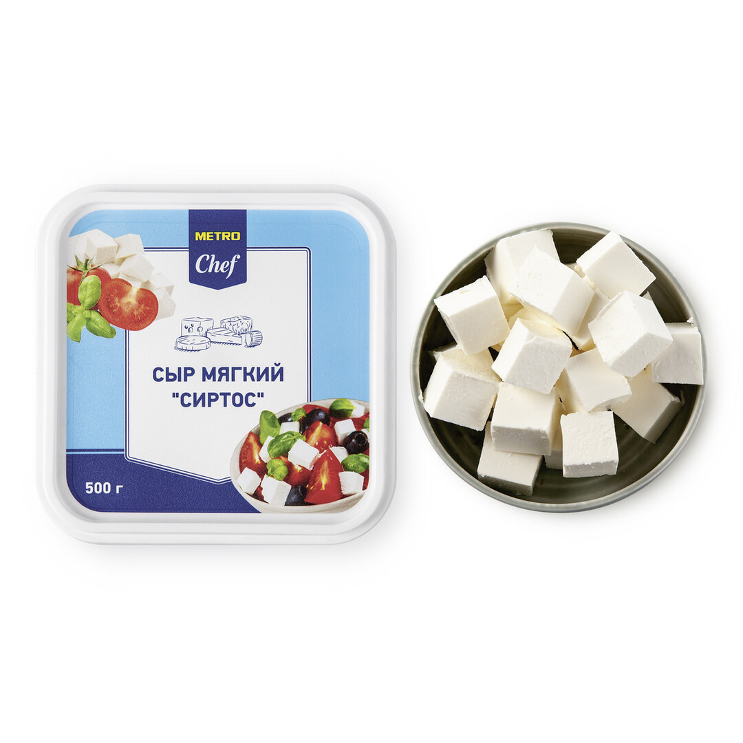 Сыр Metro Chef Сиртос мягкий 45%, 500 г обладает нежной текстурой и приятным, слегка солоноватым вкусом с хорошо сбалансированной легкой кислинкой. Этот продукт создан из пастеризованного молока. Он легко разрезается при помощи сырного ножа. Использовать сыр можно в разных целях. Порезанный небольшими кубиками, он станет оптимальным выбором для приготовления аппетитного греческого салата – блюда, состоящего из свежих огурцов, помидоров, болгарского перца, сладкого красного лука и маслин. Сыр также можно добавлять в выпечку и омлеты, делать с ним сэндвичи и бутерброды. Продукт помещен в пластиковую коробку. Такая емкость легко открывается и надежно закрывается буквально в два касания, гарантируя сохранение свежести сыра.