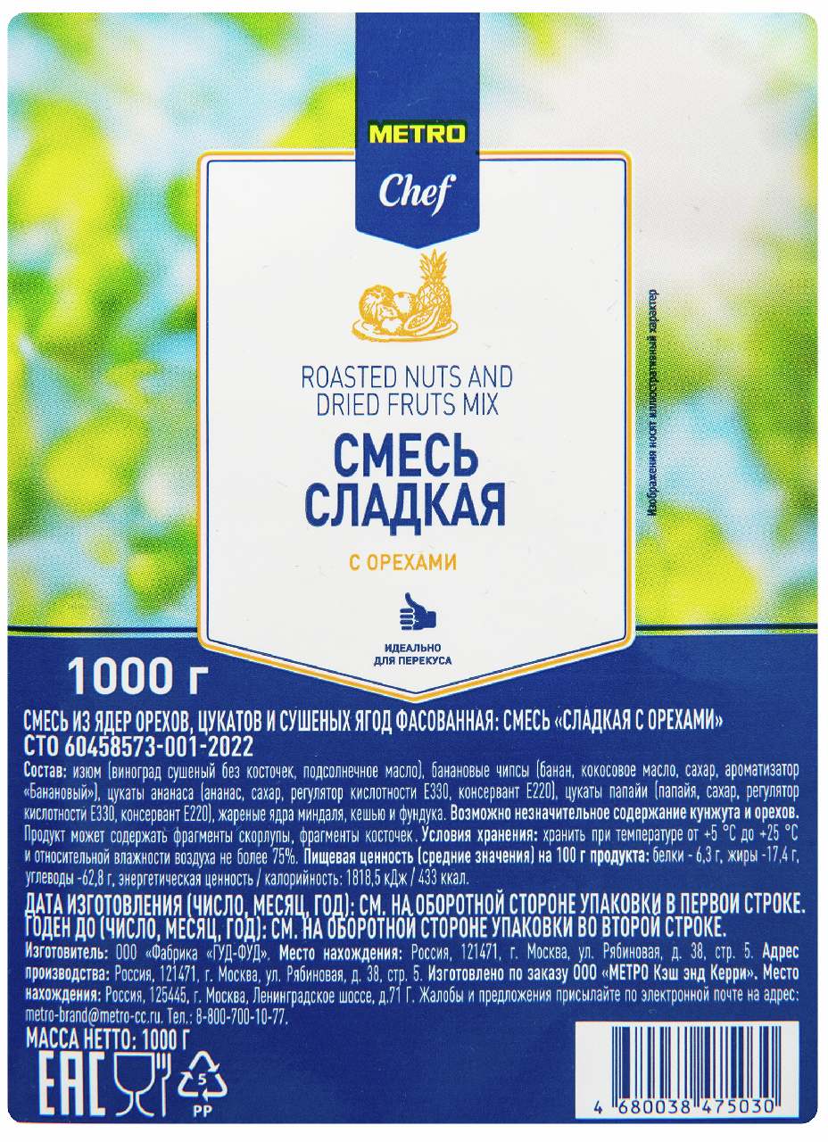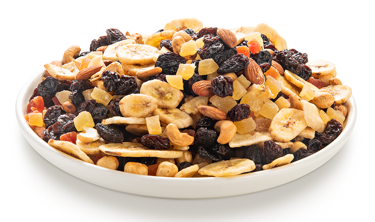 Вкусный и полезный снэк в практичной упаковке, состоящий из тёмного изюма, банановых чипсов, цукатов ананаса и папайи и жареных миндаля, фундука, кешью.