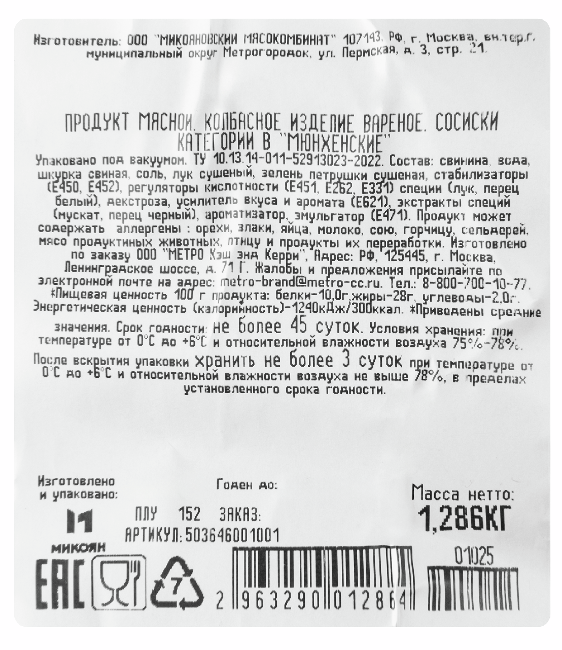 METRO Chef Сосиски Мюнхенские, ~1.2кг