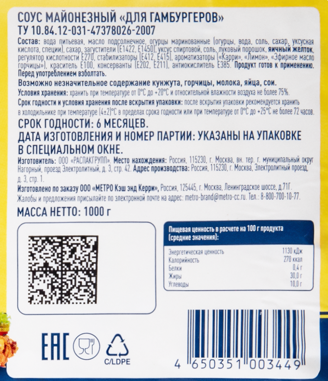 Вода питьевая, масло подсолнечное, огурцы маринованные (огурцы, вода, соль, сахар, уксусная кислота, специи), сахар, загустители (Е1422, Е1450), уксус спиртовой, соль, луковый порошок, яичный желток, регулятор кислотности Е270, стабилизаторы (Е412, Е415), ароматизаторы (Карри, Лимон, Эфирное масло горчицы), краситель Е100, консерванты (Е202, Е211), антиокислитель Е385.