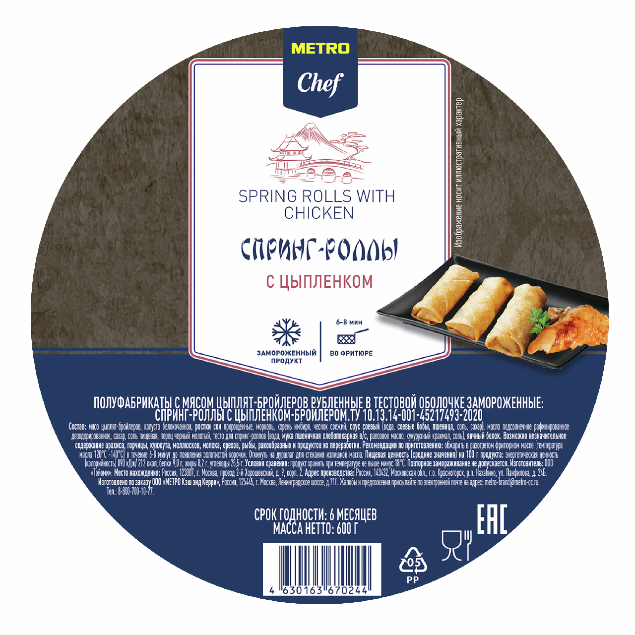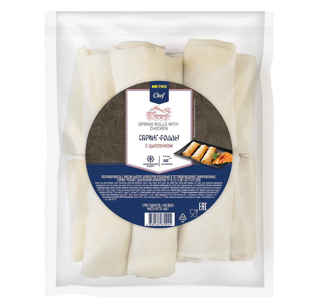 Спринг-роллы это популярная в азиатском регионе закуска, представляющая собой завернутую в тончайшее, почти прозрачное тесто начинку. Спринг-роллы METRO CHEF с цыплёнком так легко готовить - просто обжарить в разогретом фритюрном масле (температура масла 120 С -140С) в течение 6-8 минут до появления золотистой корочки. Откинуть на дуршлаг для стекания излишков масла. Подавать можно сразу, дополнив любимым соусом.