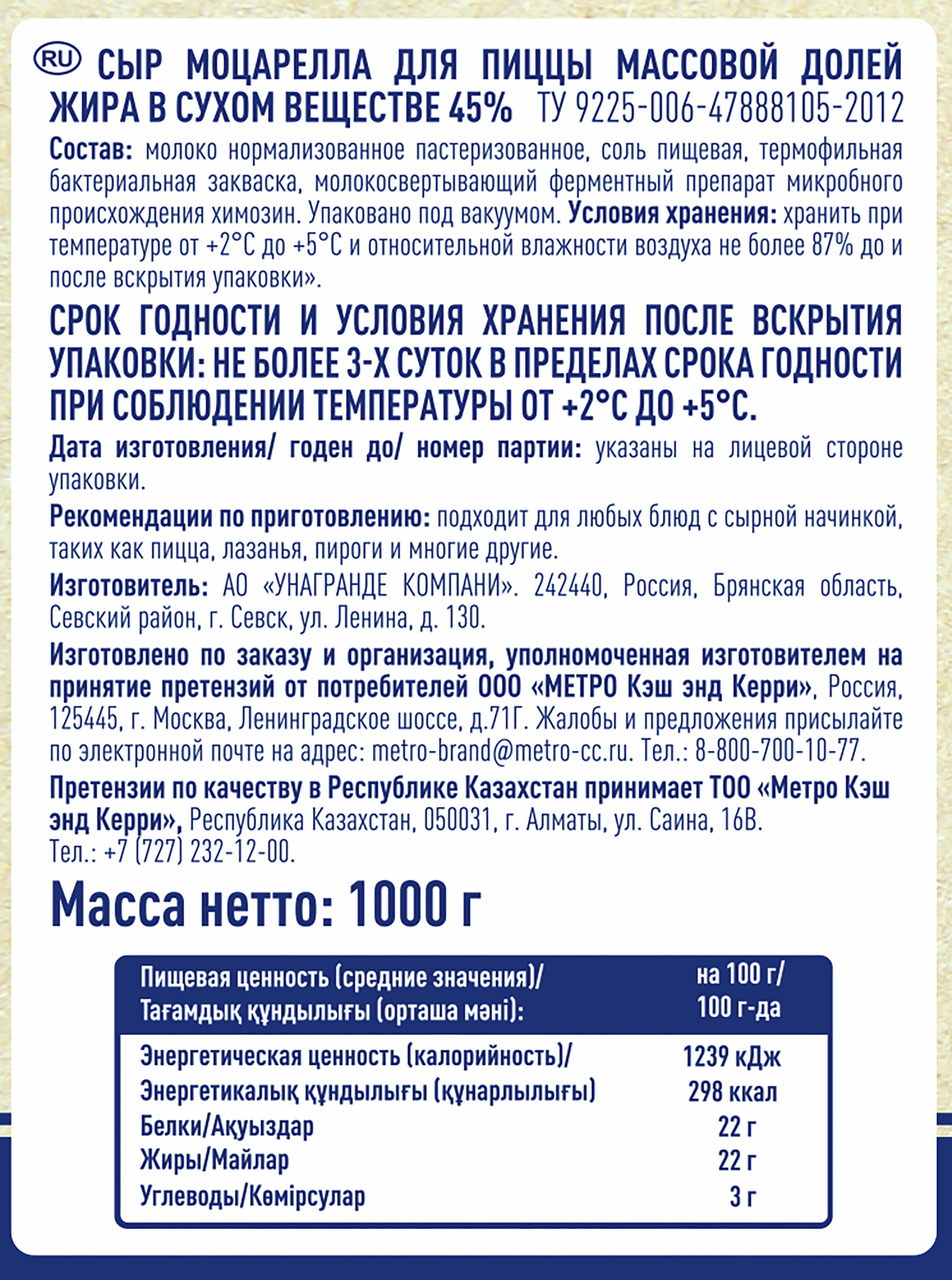METRO Chef Сыр моцарелла для пиццы кусок 45%, 1кг