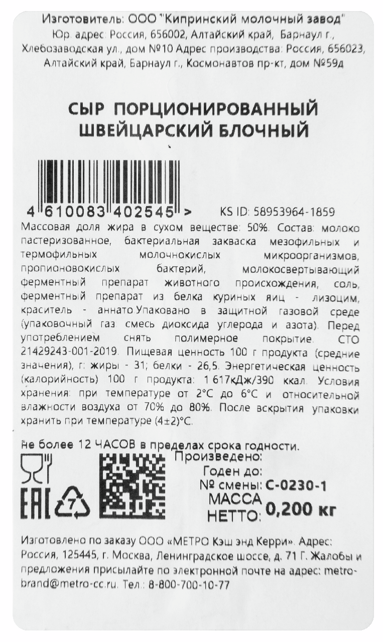 Молоко пастеризованное, бактериальная закваска мезофильных и термофильных молочнокислых микроорганизмов, пропионовокислых бактерий, соль пищевая, молокосвертывающий ферментный препарат животного происхождения, уплотнитель – хлорид кальция, консервант – нитрат калия, краситель пищевой – аннато.