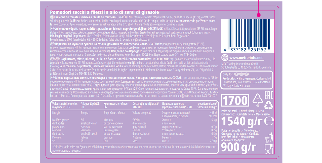 Сушёные томаты, подсолнечное масло, каперсы, сахар, соль, винный уксус, содержит сульфиты, регулятор кислотности: молочная кислота, лимонная кислота, зелень, антиоксидант: аскорбиновая кислота.