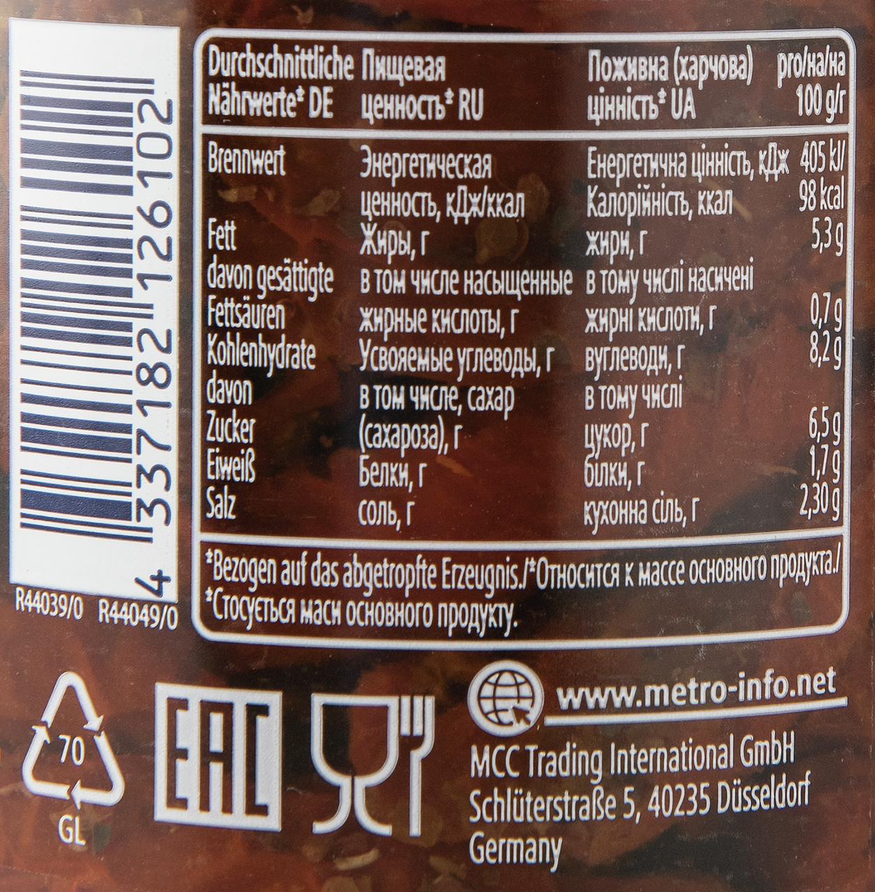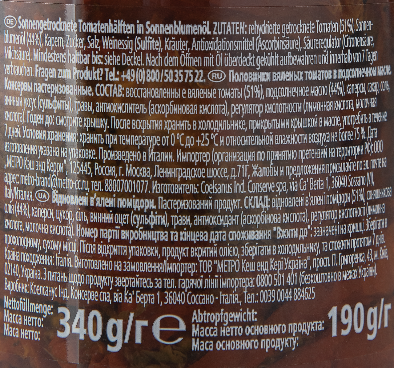 Восстановленные вяленые томаты (51%), подсолнечное масло (44%), винный уксус (содержит сульфиты), соль, каперсы, травы, регулятор кислотности (лимонная кислота, молочная кислота), антиокислитель (аскорбиновая кислота).