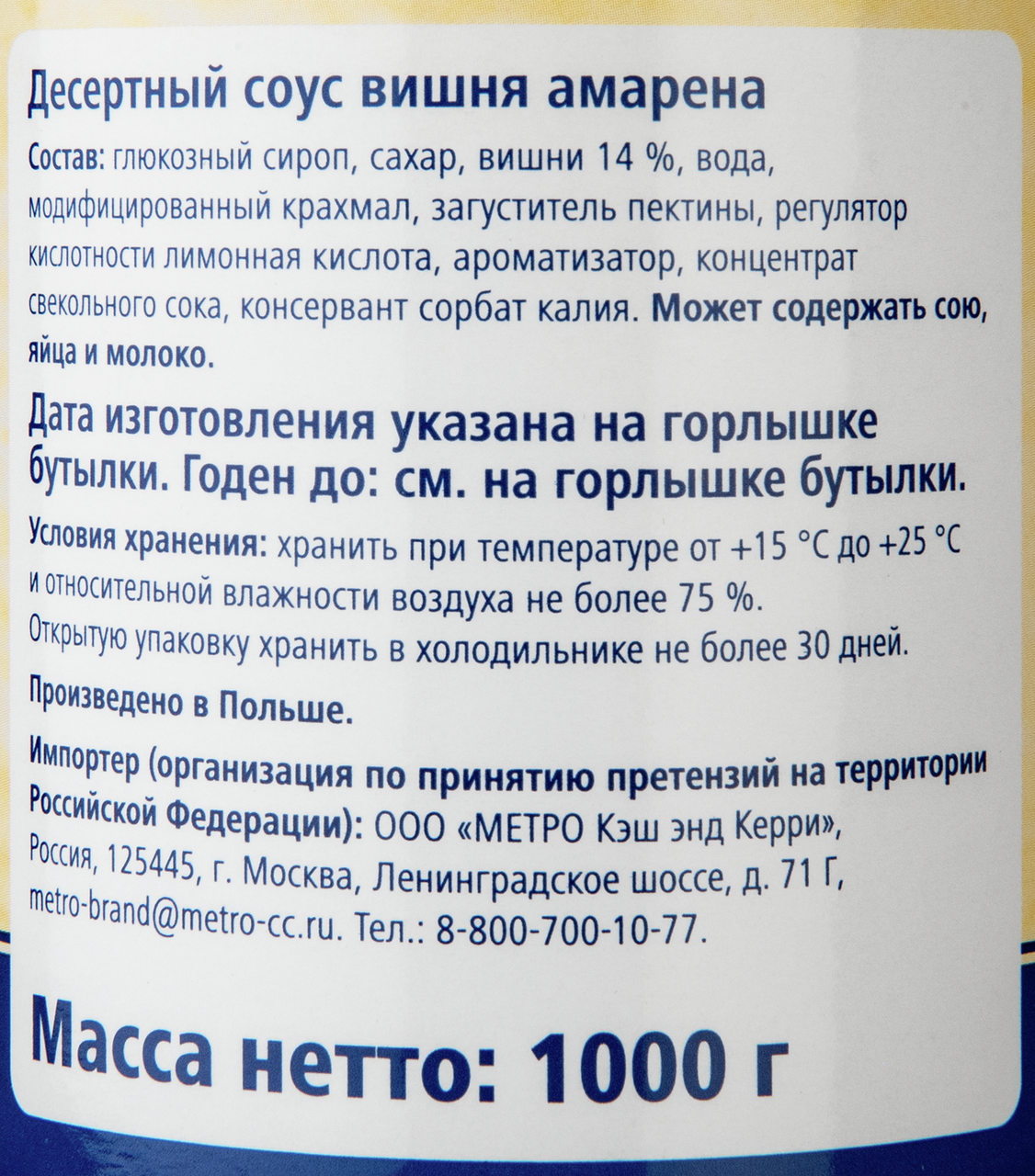 METRO Chef Десертный соус вишня амарена, 1кг универсальная основа для приготовления различных сладких блюд. В составе продукта присутствует много натуральной вишни, что делает его вкус особенно насыщенным и пикантным. Продукт обладает густо, тягучей текстурой, может подаваться в качестве подливки к блинам, сырникам, запеканкам, мороженому, вафлям или просто намазываться на сдобную булку. Отлично подходит в качестве соусов для фруктовых салатов, приготовления сладких шейков и коктейлей. Используется как добавка к напиткам или украшение. Может добавляться в домашние кремы и йогурты.