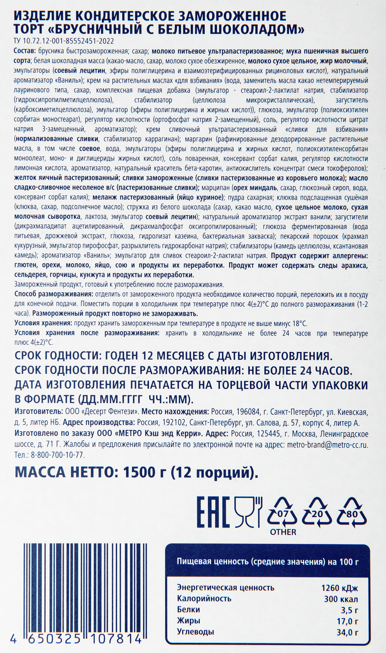 Брусника быстрозамороженная, сахар, молоко питьевое ультрапастеризованное, мука пшеничная высшего сорта, белая шоколадная масса (какао-масло, сахар, молоко сухое обезжиренное, молоко сухое цельное, жир молочный, эмульгаторы (соевый лецитин, эфиры полиглицерина и взаимоэтерифицированных рициноловых кислот), натуральный ароматизатор Ваниль), крем на растительных маслах для взбивания (вода, заменитель масла какао нетемперируемый лауринового типа, сахар, комплексная пищевая добавка (эмульгатор стеароил-2-лактилат натрия, стабилизатор (гидроксипропилметилцеллюлоза), стабилизатор (целлюлоза микрокристаллическая), загуститель (карбоксиметилцеллюлоза), эмульгатор (эфиры полиглицерина и жирных кислот)), глюкоза, эмульгатор (полиоксиэтилен сорбитан моностеарат), регулятор кислотности (ортофосфат натрия 2-замещенный), соль, регулятор кислотности цитрат натрия 3-замещенный, ароматизатор), крем сливочный ультрапастеризованный "сливки для взбивания" (нормализованные сливки, стабилизатор каррагинан), маргарин (рафинированные дезодорированные растительные масла, в том числе соевое, вода, эмульгаторы (эфиры полиглицерина и жирных кислот, полиоксиэтиленсорбитан моноолеат, моно- и диглицериды жирных кислот), соль поваренная, консервант сорбат калия, регулятор кислотности лимонная кислота, ароматизатор, натуральный краситель бета-каротин, антиокислитель концентрат смеси токоферолов), желток яичный пастеризованный, сливки замороженные (сливки пастеризованные из коровьего молока), масло сладко-сливочное несоленое в/с (пастеризованные сливки), марципан (орех миндаль, сахар, глюкозный сироп, вода, консервант сорбат калия), меланж пастеризованный (яйцо куриное), пудра сахарная, клюква подслащенная сушёная (клюква, сахар, подсолнечное масло), стружка из белого шоколада (сахар, какао масло, сухое цельное молоко, сухая молочная сыворотка, лактоза, эмульгатор соевый лецитин), натуральный ароматизатор экстракт ванили, загустители (дикрахмаладипат ацетилированный, дикрахмалфосфат оксипропилированный), глюкоза ферментированная (вода питьевая, дрожжевой экстракт, глюкоза, гидролизат казеина, бактериальная закваска), пекарский порошок (крахмал кукурузный, эмульгатор пирофосфат, разрыхлитель гидрокарбонат натрия), стабилизаторы (камедь целлюлозы, ксантановая камедь), ароматизатор Ваниль, эмульгатор для сливок стеароил-2-лактилат натрия.