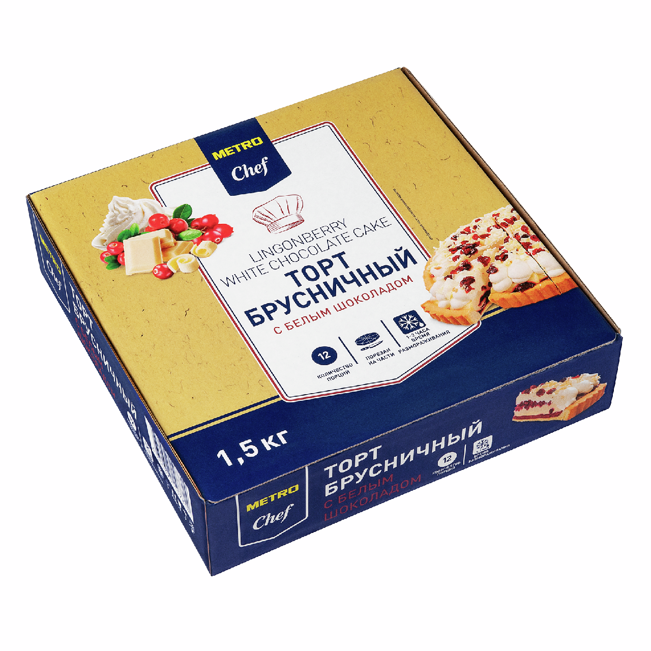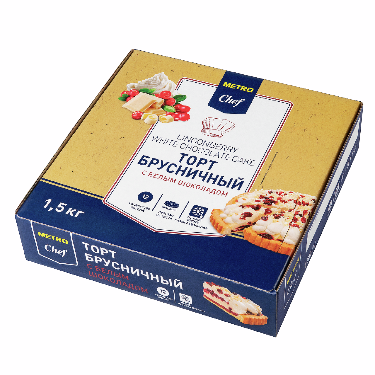Брусничный торт сочетает сладкий вкус белого шоколада и легкой ягодной кислинки. Легко подать на стол: отделить от замороженного продукта необходимое количество порций, переложить их в посуду для конечной подачи, поместить порции при температуре плюс 4 (+/-2)С до полного размораживания (1-2 часа). Размороженный продукт повторно не замораживать. Торт с начинкой из брусники и белого шоколада, взбитыми сливками, украшенный белым шоколадом и клюквой. Основу десерта составляет песочное тесто, а в качестве начинки выступает белый шоколад со взбитыми сливками и кисленькими ягодами. В меру сладкий торт разделен на 12 порций.