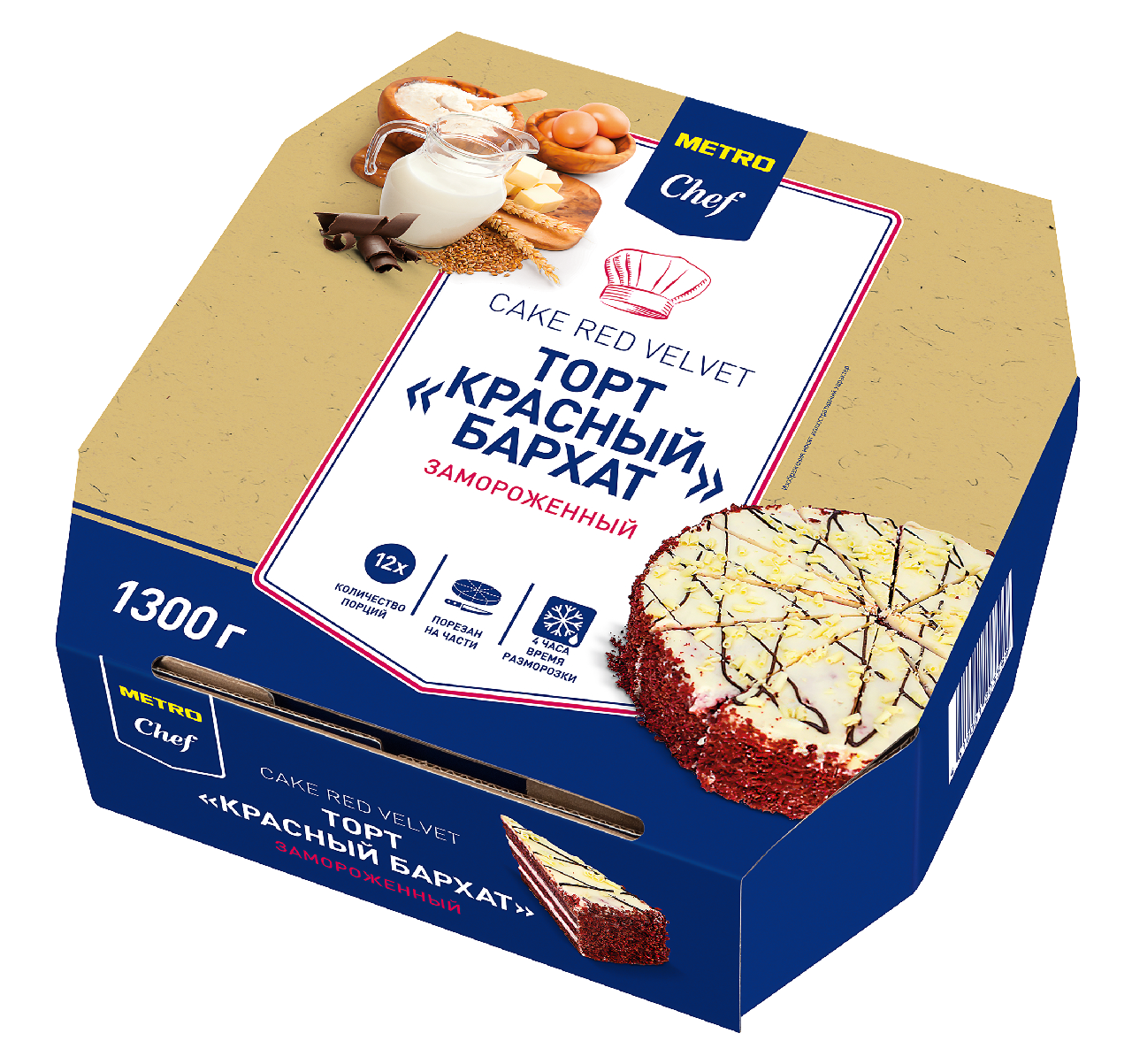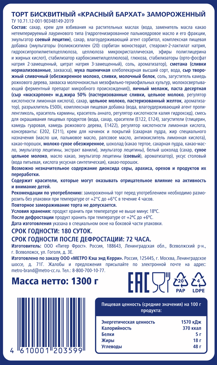 Торт Красный бархат METRO Chef сделан из ярко-красного бисквита со вкусом шоколада и крема с пастой маскарпоне. Он почти готов к употреблению - нужно только разморозить без упаковки при температуре от 2С до 6С в течение 4 часов. Для удобства он предварительно разрезан на 12 порций, так что вы можете доставать отдельные куски по мере необходимости.