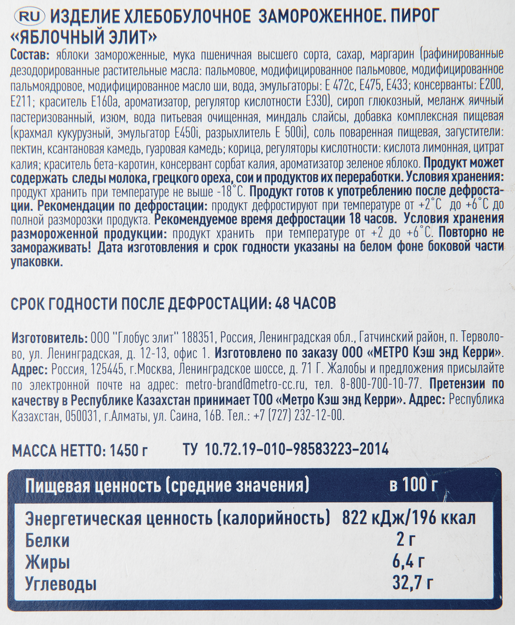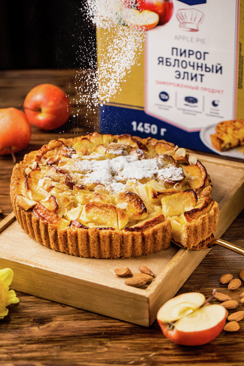 Яблоки замороженные, мука пшеничная высшего сорта, сахар, маргарин (рафинированные дезодорированные растительные масла: пальмовое, модифицированное пальмовое, модифицированное пальмоядровое, модифицированное масло ши, вода, эмульгаторы: Е 472с, Е475, Е433; консерванты: Е200, Е211; краситель Е160а, ароматизатор, регулятор кислотности Е330), сироп глюкозный, меланж яичный пастеризованный, изюм, вода питьевая очищенная, миндаль слайсы, добавка комплексная пищевая (крахмал кукурузный, эмульгатор Е450i, разрыхлитель Е500 i), соль поваренная пищевая, загустители: пектин, ксантановая камедь, гуаровая камедь, корица, регуляторы кислотности: кислота лимонная, цитрат калия; краситель бета-каротин, консервант сорбат калия, ароматизатор зелёное яблоко.