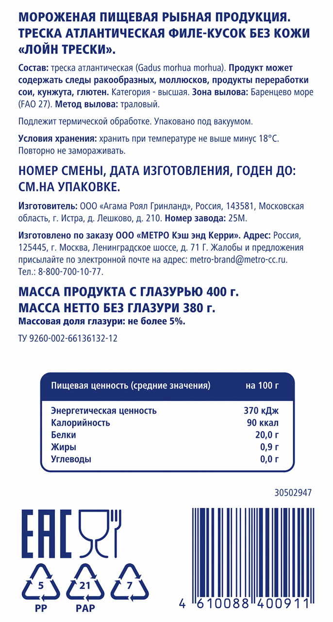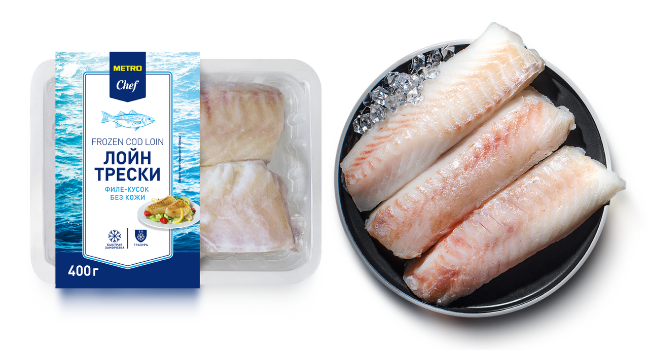 METRO Chef Лойн атлантической трески без кожи свежемороженый, 400г это спинка рыбы, которую считают наиболее ценной часть тушки. Нежная мякоть полностью лишена костей. Она обладает идеальной формой и красиво выглядит на тарелке во время порционной подачи. Филе получено от трески выловленной тралом в чистых водах Атлантического океана. Рыба обработана на судне и подвергнута шоковой заморозке, сохраняющей полезные вещества и структуру мякоти. Лойн хорошо подходит для создания низкокалорийных и питательных блюд. Его готовят на пару, запекают в фольге под сырной корочкой, жарят, тушат под маринадом, обрабатывают в аэрогриле. Продукт богат белком и аминокислотами, витаминами В12 и Р, йодом и фосфором. Его включают в состав низкокалорийной и лечебной диеты, добавляют в рацион спортсменов, детей и пожилых людей. Продукт нормализует уровень холестерина, снижает риск возникновения тромбоза, инсульта и инфаркта. Его следует хранить при температуре не выше -18С и размораживать постепенно, переложив из морозильной камеры холодильника в основную. Это позволит сохранить структуру мякоти, ее нежный вкус и полезные свойства.