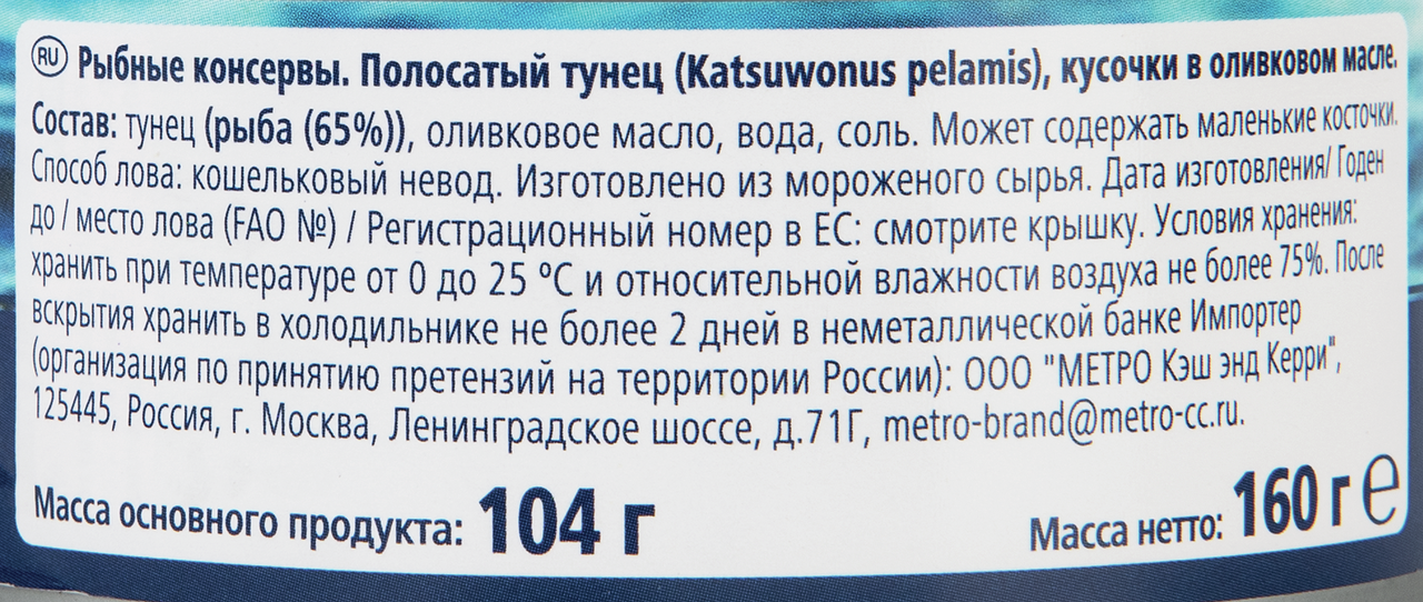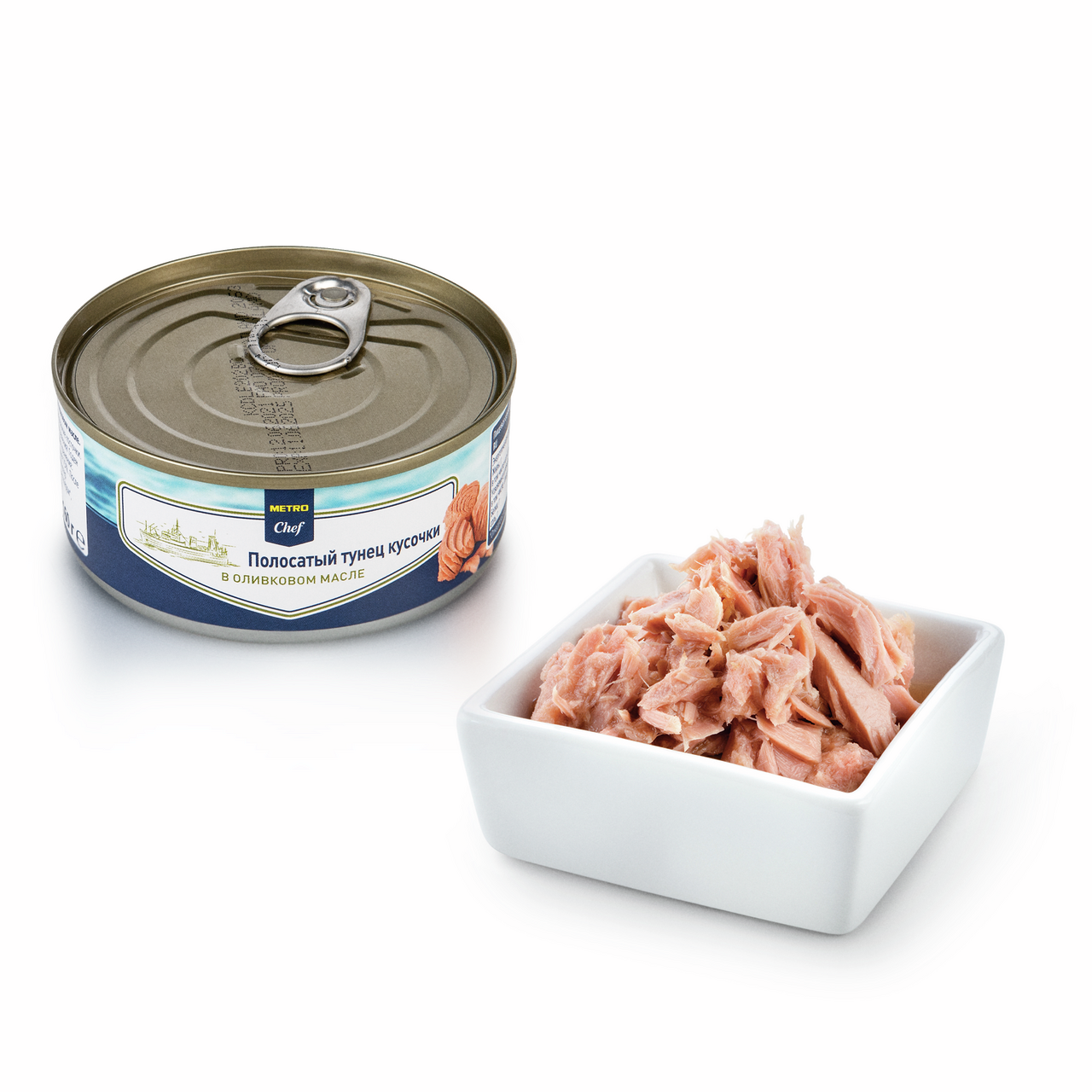 Тунец Metro Chef кусочки в оливковом масле 160г подходит для приготовления различных блюд. С ним можно готовить сэндвичи, добавлять в пасту, в салаты, сочетать с соусами. У продукта яркий вкус с легкими пряными нотками и долгоиграющее послевкусие. Он поставляется в оливковом масле, а значит, обеспечивает организм не только белками, но и полезными жирами. Тунец считается диетическим продуктом с низким содержанием калорий, поэтому на него стоит обратить внимание всем, кто тщательно следит за своим весом. Продукт богат фосфором, натрием, жирными кислотами омега, витаминами группы В.
